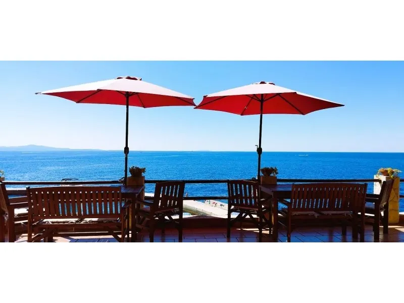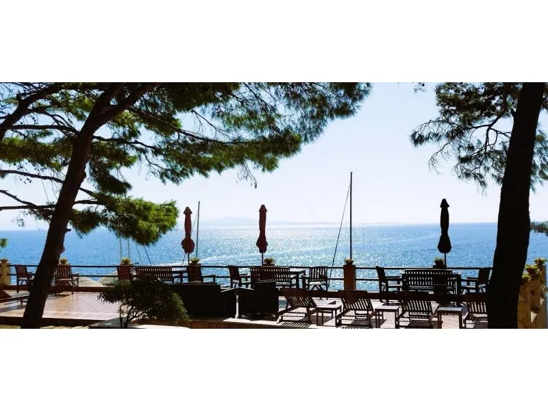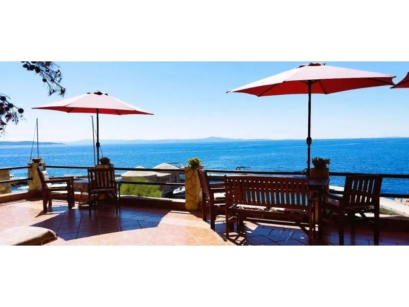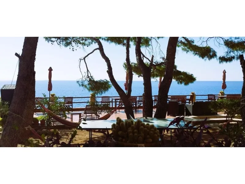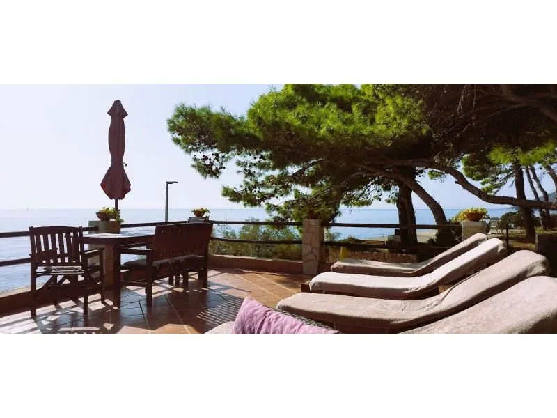 In prima fila davanti al mare (ca. 30 metri dalla riva) su un appezzamento di ca. 800 m2 su un leggero piano inclinato con una pendenza di 25 ° strada asfaltata fino alla villa dove la strada termina edificio indipendente in un bosco di pini in mezzo ai quali la spianata vi consente di giocare a pallavolo, ping-pong, pallapiuma e altro tutte le stanze dispongono di un bagno, loggia, terrazza o balcone con vista sul...